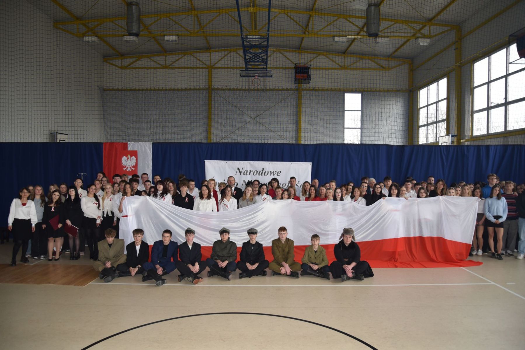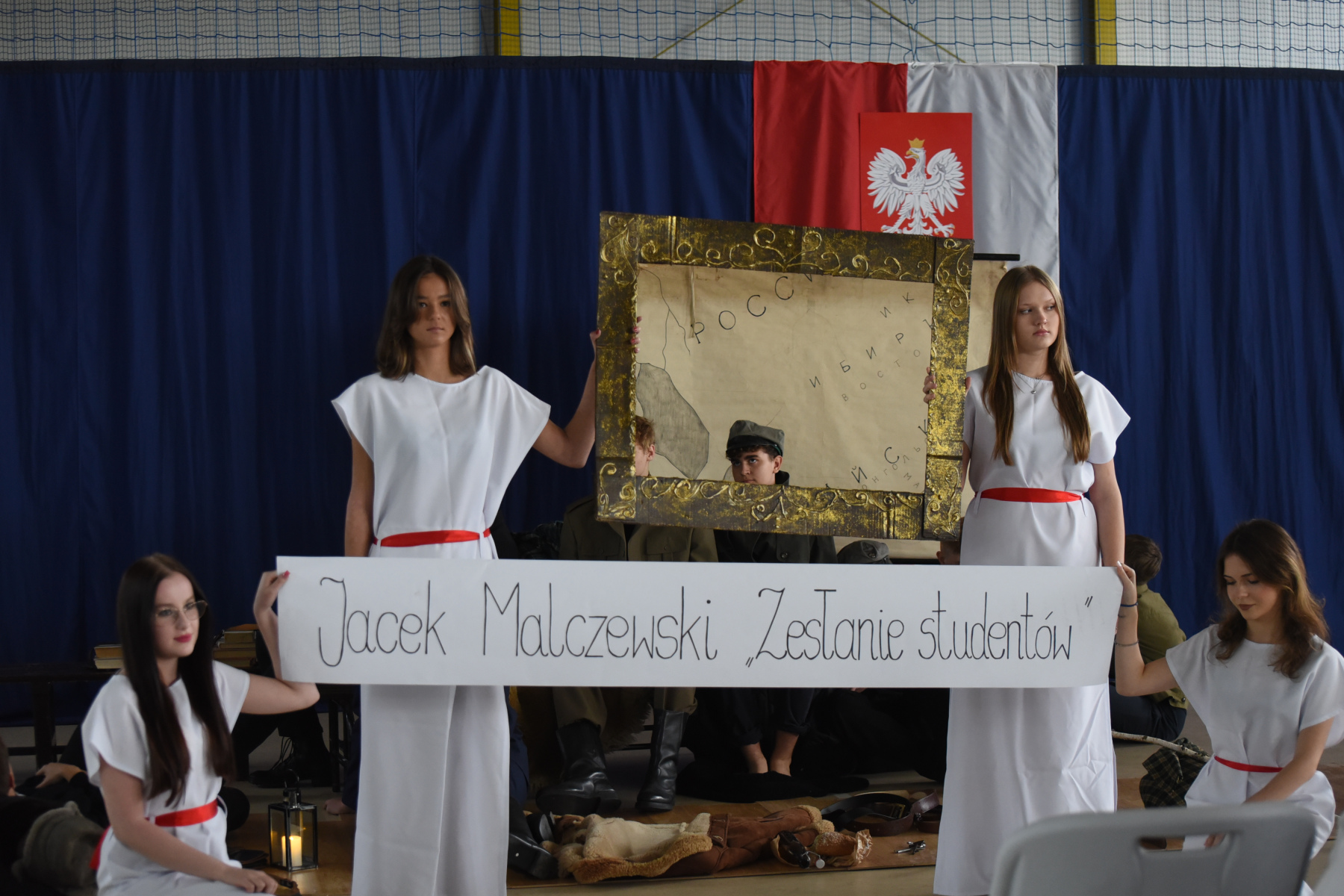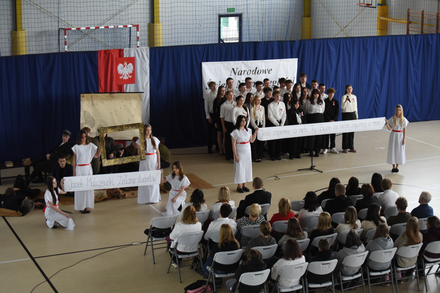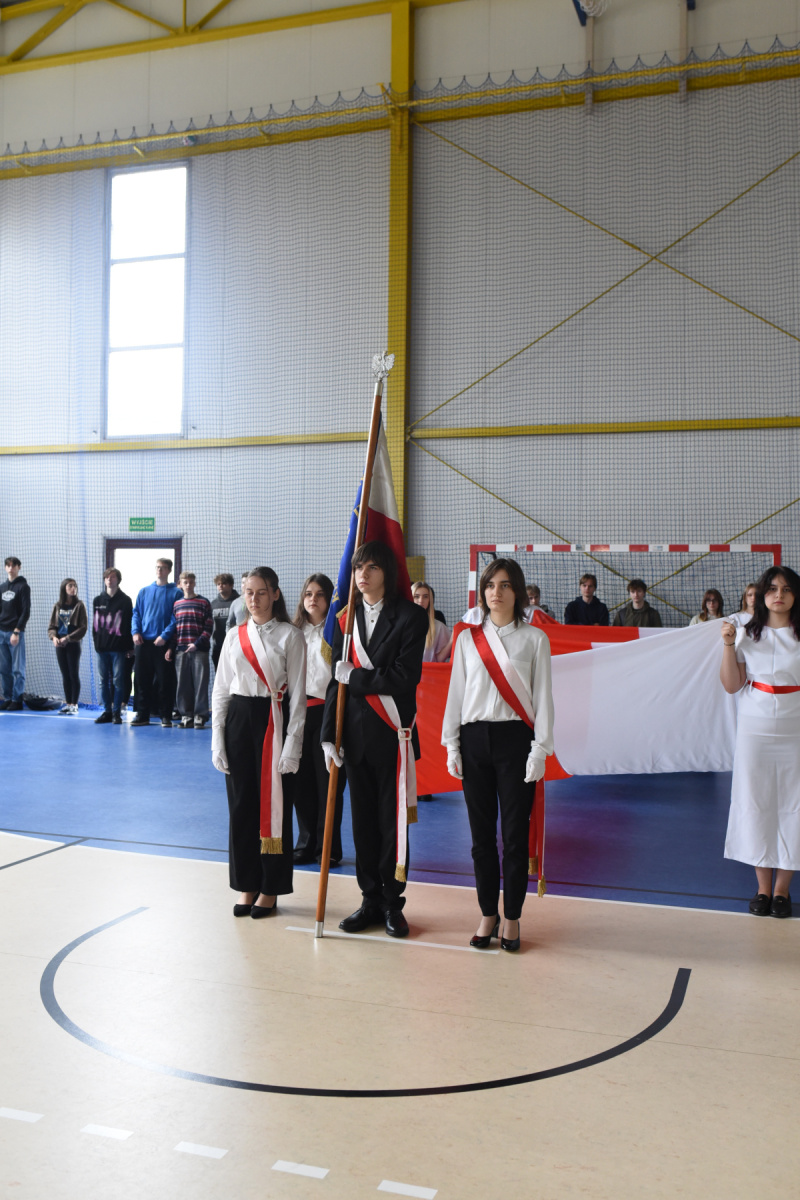 „Narodowe Święto Niepodległości” uczciliśmy wyjątkową lekcją – najpierw uczniowie wzięli udział w międzyklasowym turnieju wiedzy o II Rzeczpospolitej, a potem w widowisku inspirowanym malarstwem Jacka Malczewskiego i „Dziadami” cz. III A. Mickiewicza. Słowa padające ze sceny: Tułacze, zesłańcy, katorżnicy, Sybiracy…ilu przed nimi?, ilu po nich? …. …nigdy się nie dowiemy, ale wszyscy oni śnili sen o Polsce, wielu z nas zapadły głęboko w pamięci. Pewnie dlatego uroczyste odśpiewanie „Mazurka Dąbrowskiego” , któremu towarzyszył poczet sztandarowy i poczet flagowy- stało się przeżyciem integrującym całą naszą społeczność.